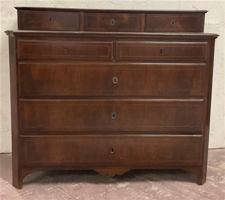 Cassettone con alzata, fronte sagomato a due cassetti piccoli e tre grandi, grembiale sagomato. Secolo XIX (cm 124x108x60) (difetti e mancanze)