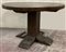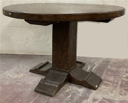 Tavolo tondo in legno con fusto squadrato e piedi a ciabatta (h cm 78, d cm 120) (difetti)