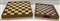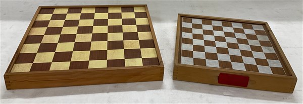 Lotto composto da un tavolino da gioco con piano in panno verde e gambe richiudibili marcato Fraber (aperto cm 79x71x79), unito a due scacchiere (difetti)