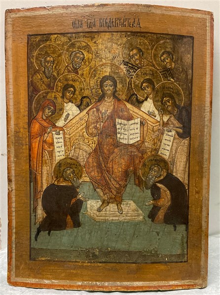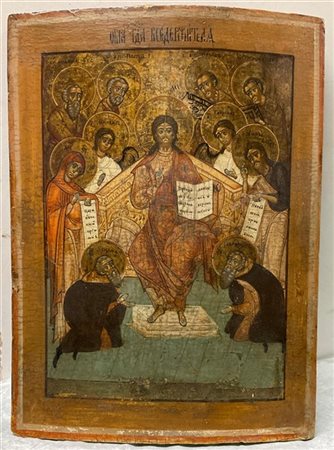 Arte russa "Cristo pantocratore con santi" icona ad olio su tavola (cm 35x26) (difetti)