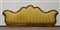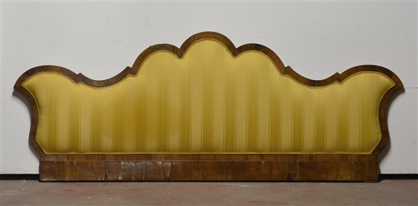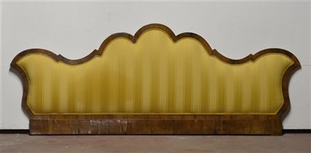 Testiera di forma mossa in legno lastronato, imbottita e rivestita in tessuto giallo (cm 211x83) (difetti e mancanze)