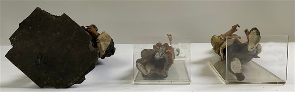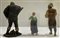 Arte popolare, inizio secolo XX. Lotto composto da tre figure da presepe, di cui due in terracotta policroma montate su base in plexiglass (h. max cm 29) e una in terracotta e cartapesta (h. cm 30,5) (difetti e mancanze)