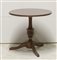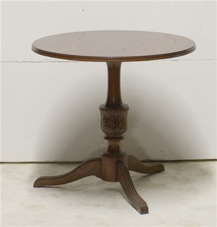 Tavolino tondo lastronato in mogano, gamba intagliata a foglie, piedi scanalati