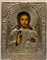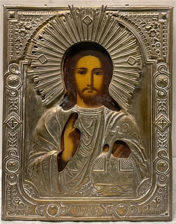 Arte russa del secolo XIX "Cristo benedicente" icona ad olio su tavola con riza in metallo argentato e sbalzato (cm 23x18) (difetti)