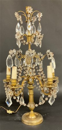 Lampada girandole in bronzo inciso a cinque luci con pendagli in cristallo (h cm 62) (difetti e mancanze)