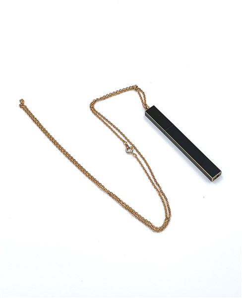 Lotto composto da un piccolo pendente portafoto decorato sul fronte con miniatura raffigurante figura femminile contornato da microperle fancy unito ad un sottile accendino con catenella (difetti e segni d'uso)