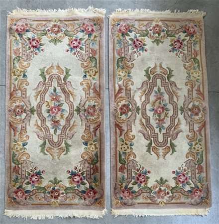 Coppia di tappeti scendiletto, Cina, secolo XX. Decoro floreale di ispirazione francese su fondo bianco (cm 153x76) (difetti)