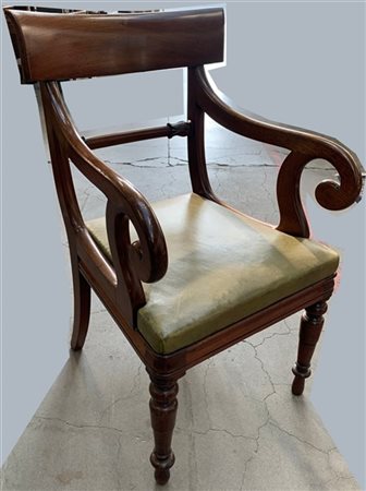 Poltrona con schienale a giorno, braccioli a ricciolo, gambe anteriori tornite,quelle posteriori a sciabola, seduta in pelle verde (difetti)