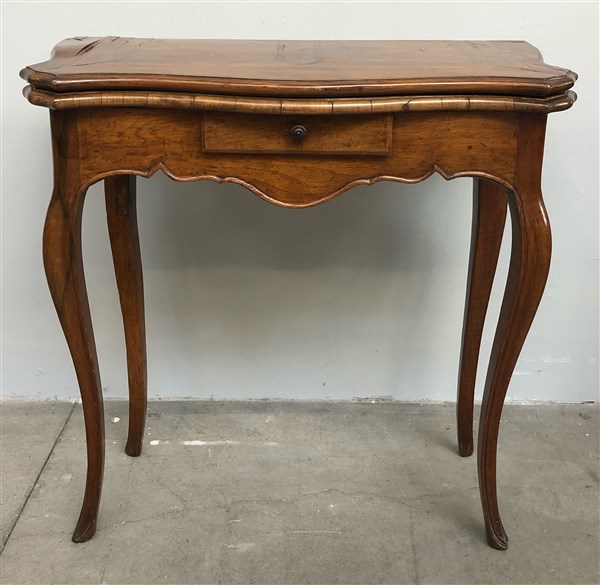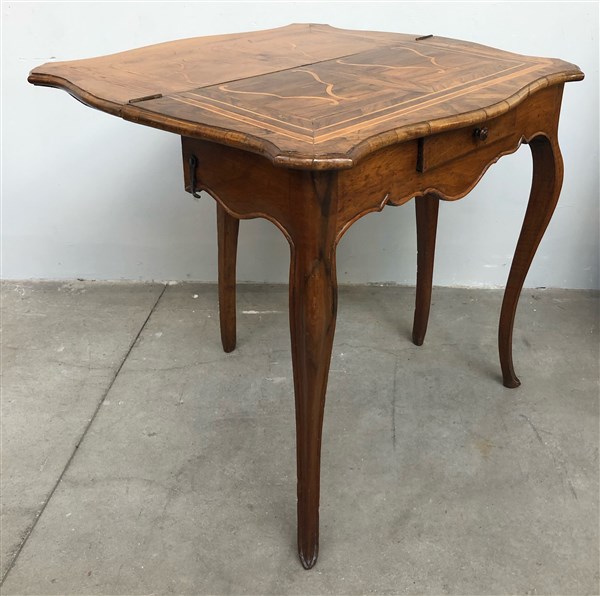 Antico tavolino da gioco in legno di forma mossa con cassetto sottopiano e pian