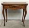 Antico tavolino da gioco in legno di forma mossa con cassetto sottopiano e piano intarsiato, gambe mosse (cm 80x78x40) (difetti)