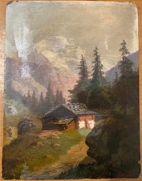 Scuola secolo XIX "Paesaggio montano" olio su cartone (cm 29x22) Iscritto in ba