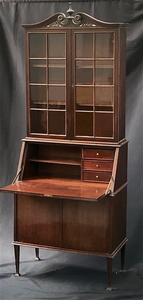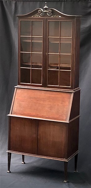 Mobile a due corpi in legno lastronato. Parte inferiore a due sportelli con ribalta celante due vani e tre cassetti. Parte superiore a due ante vetrate sormontate da cimasa a timpano spezzato (cm 88x220x47) (difetti)