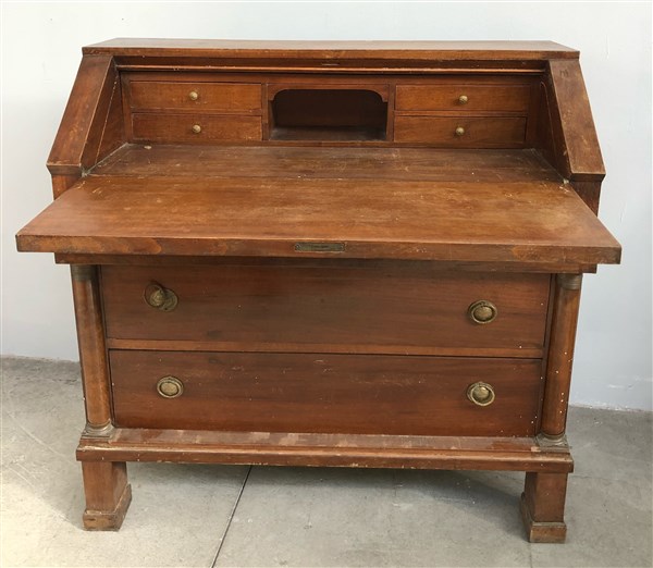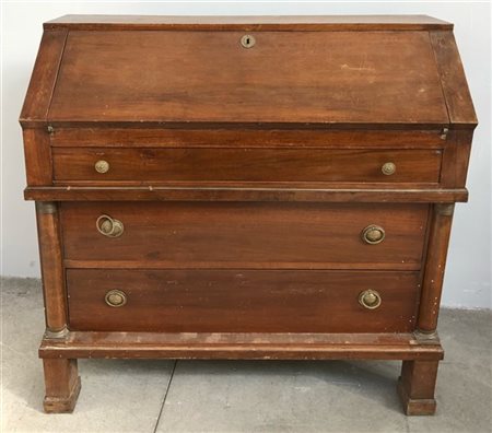 Ribalta a tre cassetti e anta ribaltabile celante vani e cassettini montanti a mezza colonna tornita, piedi a plinto (cm 102x101x46) (difetti e rotture)