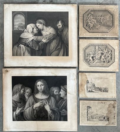 Lotto composto da sei antiche incisioni intelate, di cui due da invenzioni di M