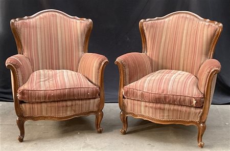 Coppia di poltrone in legno di forma mossa con imbottiture rivestite in tessuto