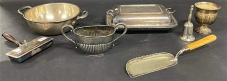 Lotto composto da una legumiera, una paletta, un raccoglibriciole, un candeliere, una campanella, un vasetto biansato ed una casseruola in metallo argentato (difetti)
