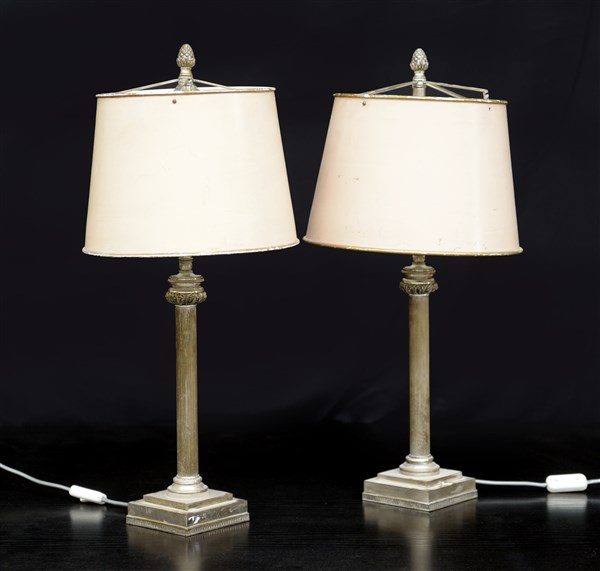 Coppia di lampade da tavolo in metallo argentato con fusto a colonna scanalata, base quadrata con fascia cesellata a greche, paralume in metallo laccato (h cm 70)(difetti)