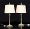 Coppia di lampade da tavolo in metallo argentato con fusto a colonna scanalata,