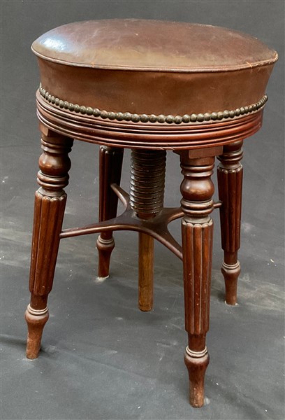 Sgabello per pianoforte in legno intagliato, gambe parzialmente scanalate. Seduta rivestita in cuoio (difetti)