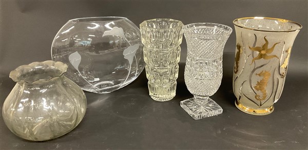 Lotto di cinque vasi in cristallo e vetro di manifatture differenti ( h max cm26) (difetti)