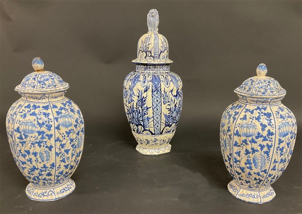 Lotto di tre potiche in ceramica a decoro monocromo blu con motivi naturalistic