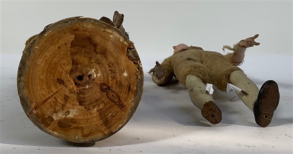 Arte napoletana, secolo XIX. Due figure da presepe con volto terracotta e occhi in vetro, arti in legno (h. max cm 37) Una su base in legno dorato (difetti e mancanze)