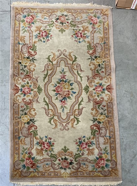 Tappeto cinese, secolo XX. Decoro floreale di ispirazione francese su fondo bianco (cm 214x122) (difetti)