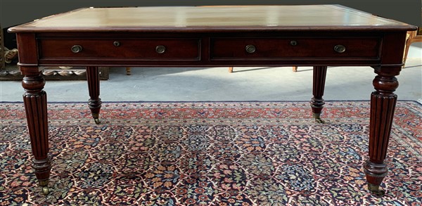 Scrivania da centro a due cassetti sottopiano, gambe tornite e scanalate,piedi con rotelle, piano in pelle impressa in oro, guarnizioni in metallo dorato (cm 121x79x75,5) (lievi difetti)