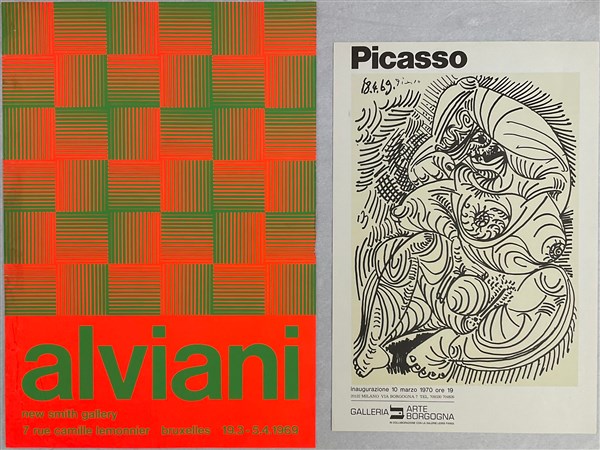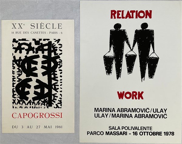 Lotto composto da nove manifesti espositivi e una stampa a colori, di misure e soggetti diversi tra cui: "Capogrossi" Galleria XX Siècle, Parigi, 1961; "Alviani" New Smith Gallery, Bruxelles, 1969; "Relation/Work. Marina Abramovic/Ulay" Parco Massari, 1978
