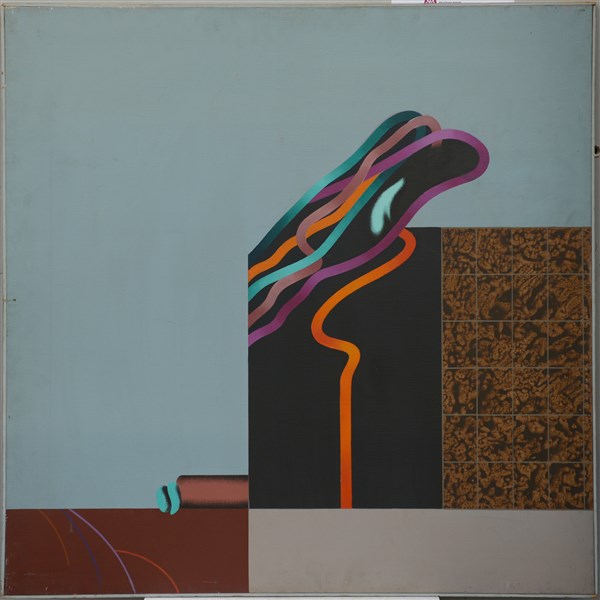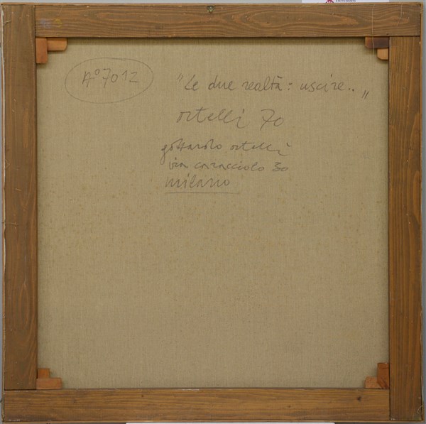 Gottardo Ortelli "Le due realtà: uscire..." 1970 acrilico su tela cm 100x100 tit