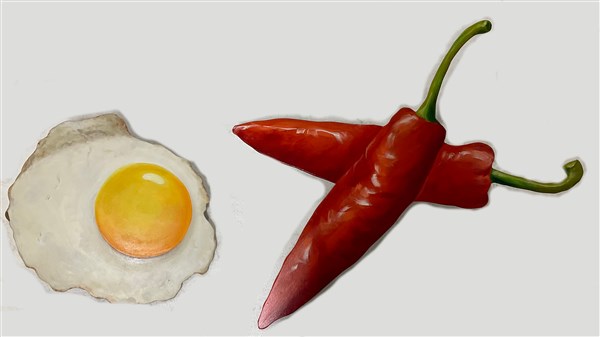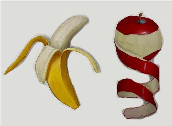 Lotto composto da quattro pannelli in legno dipinto raffiguranti rispettivamente una banana, una mela, dei peperoncini e un uovo all' "occhio di bue"