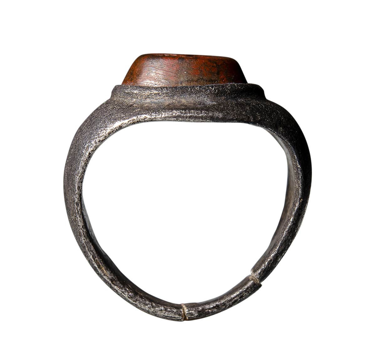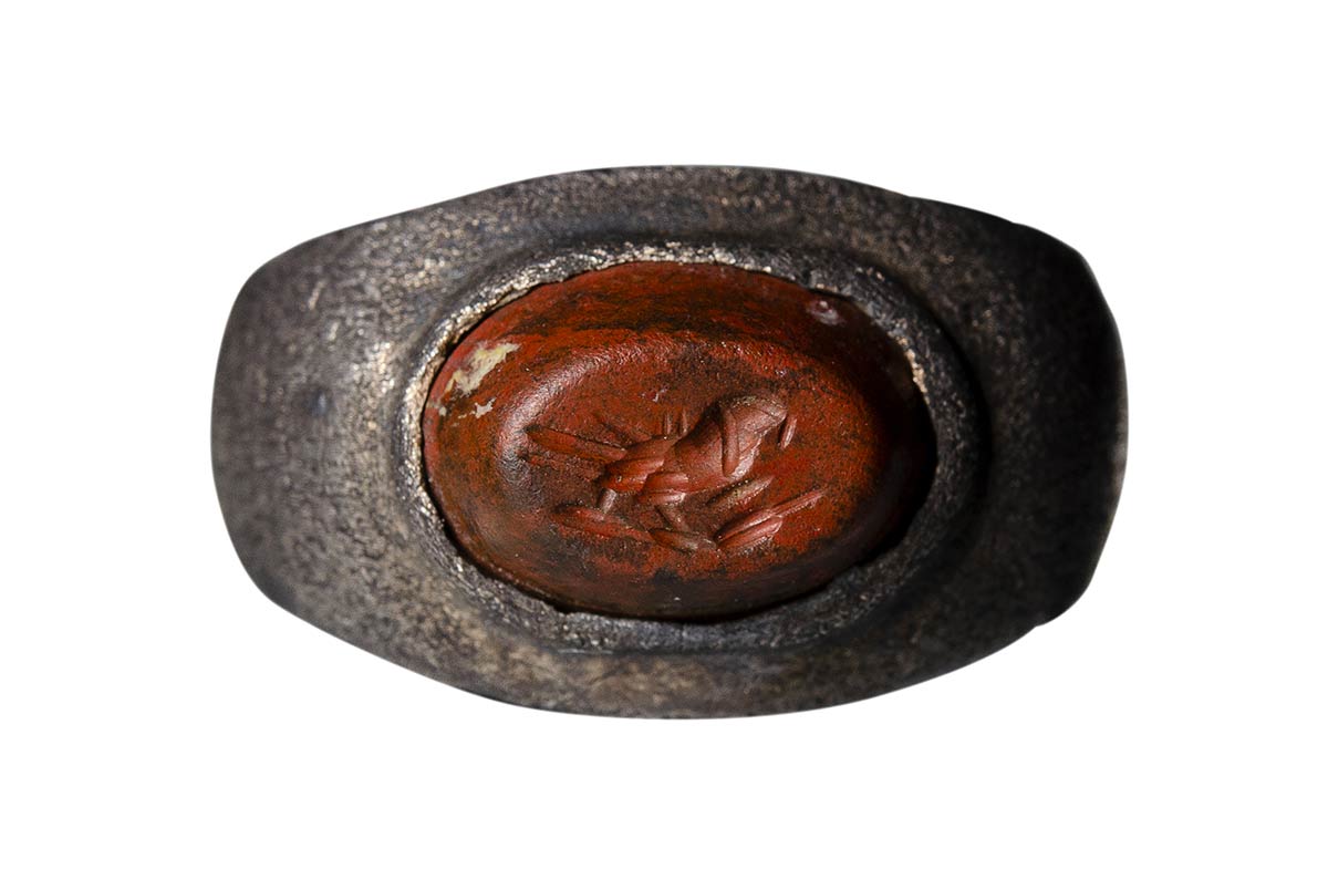 Hoop rounded without and flatten within with oval bezel set with an intaglio. Parrot facing right with a cherry.