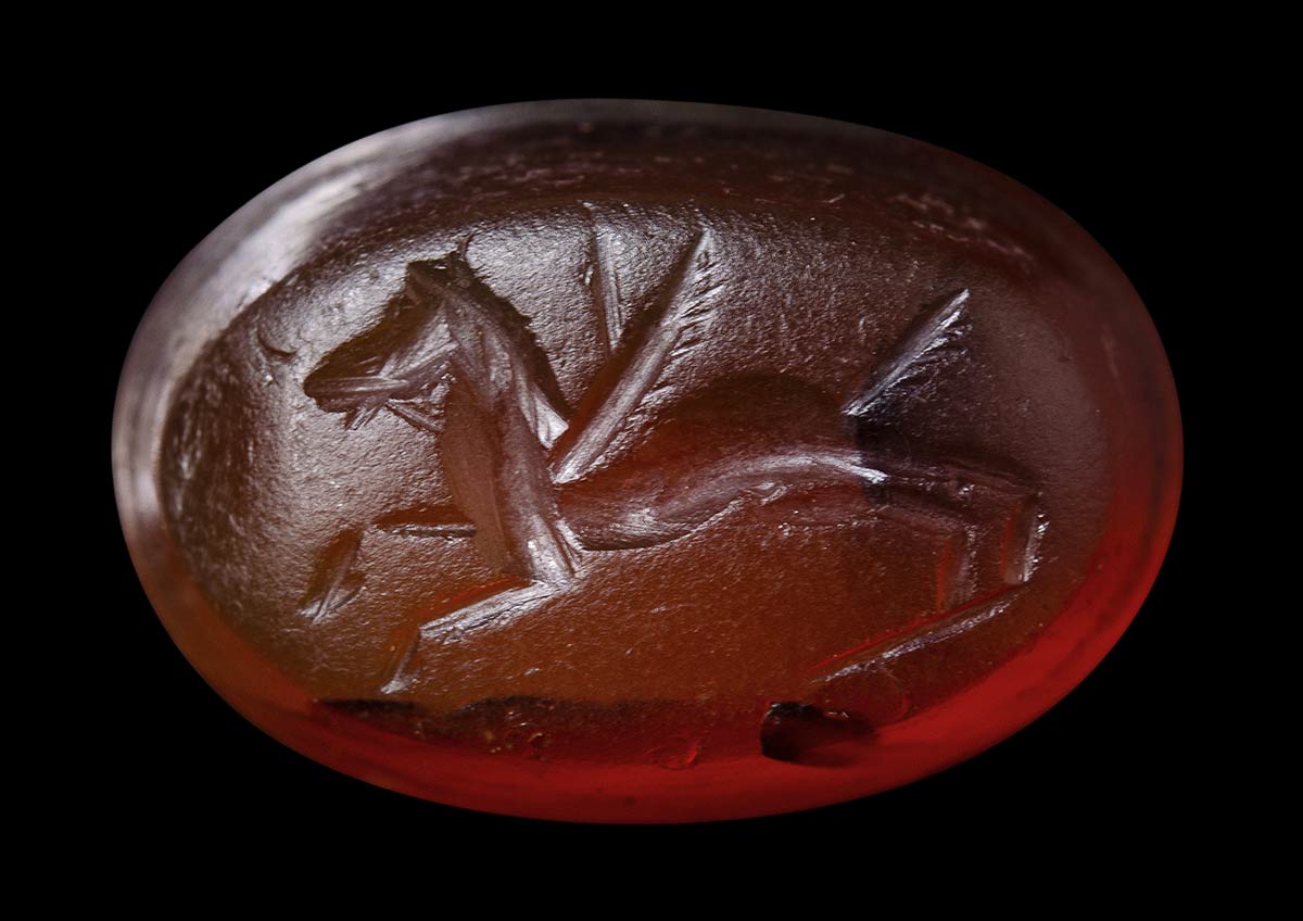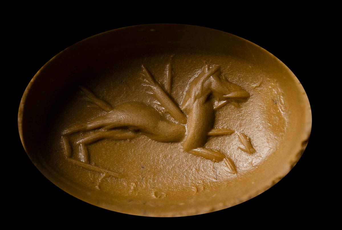 The mythological animal is facing left, with spread wings. Groundline inclined suggesting the movement of the scene. Slight wear marks.