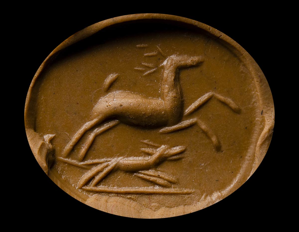 A deer facing left is running, beneath a dog following her. Groundline. Small cracks. Chips on the edge.