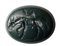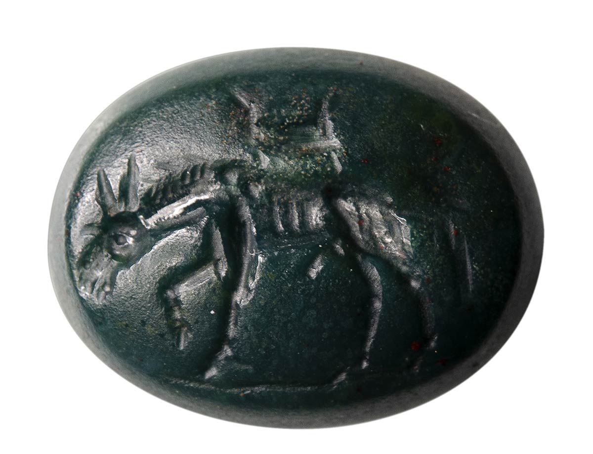 A roman green jasper intaglio. Ithyphallic donkey and latin letters.