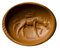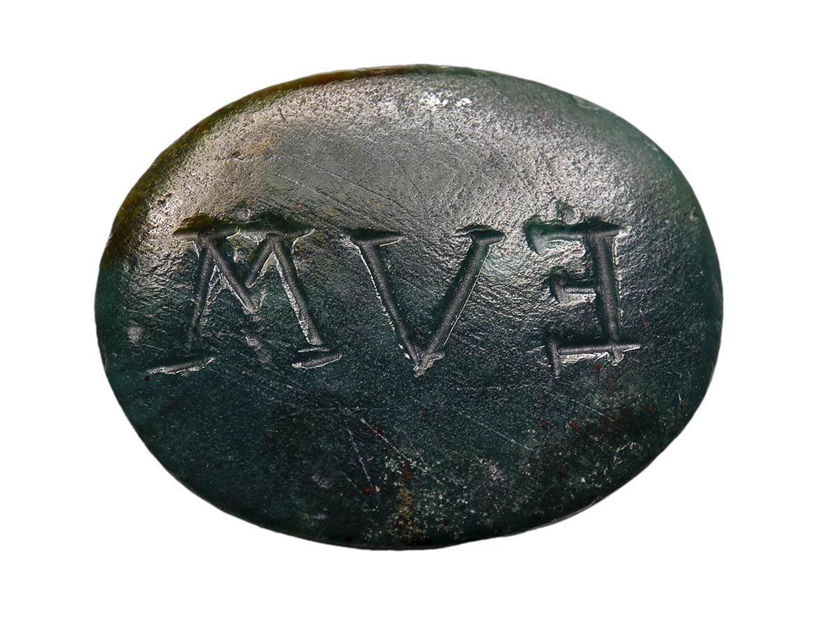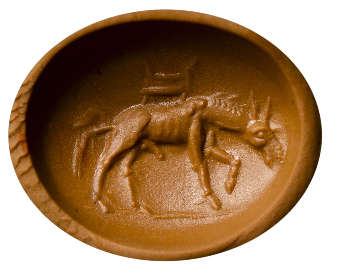A donkey is facing left, carrying a saddle with armrests (sitting?) laboriously on its back. The animal is characterized by a naturalistic and marked anatomical rendering, a large prominent phallus, symbol of fertility. On the reverse, a latin inscription « EVM », engraved backward-looking. Signs of wear. Rare subject.