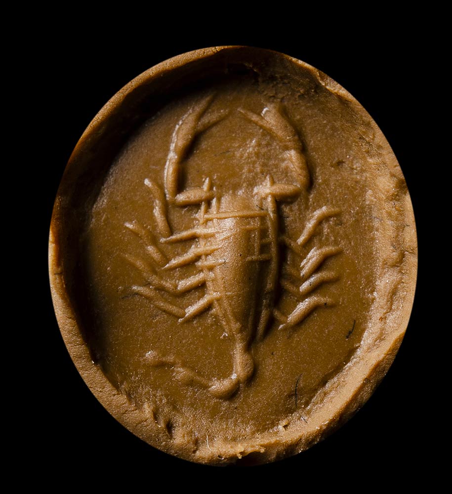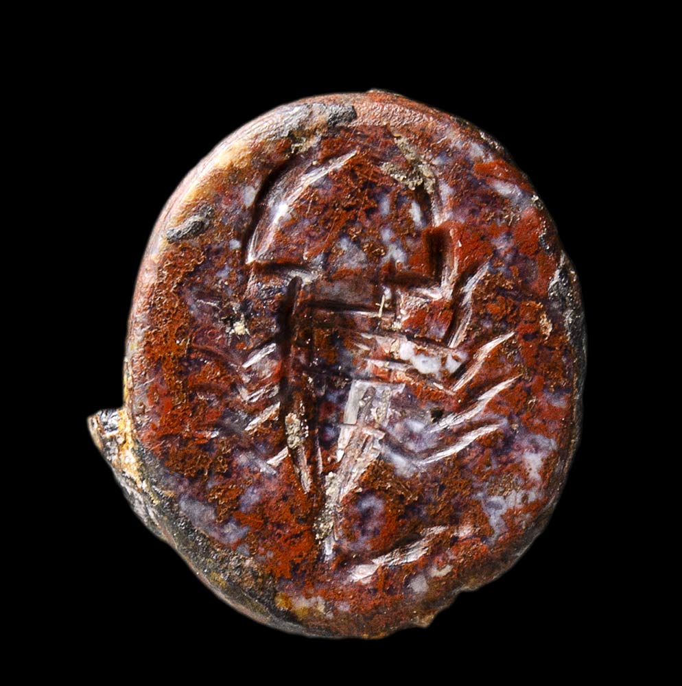 The animal is in a frontal view with naturalistic rendering. Very nice colors and shades of the stone. Traces of iron mounting.