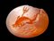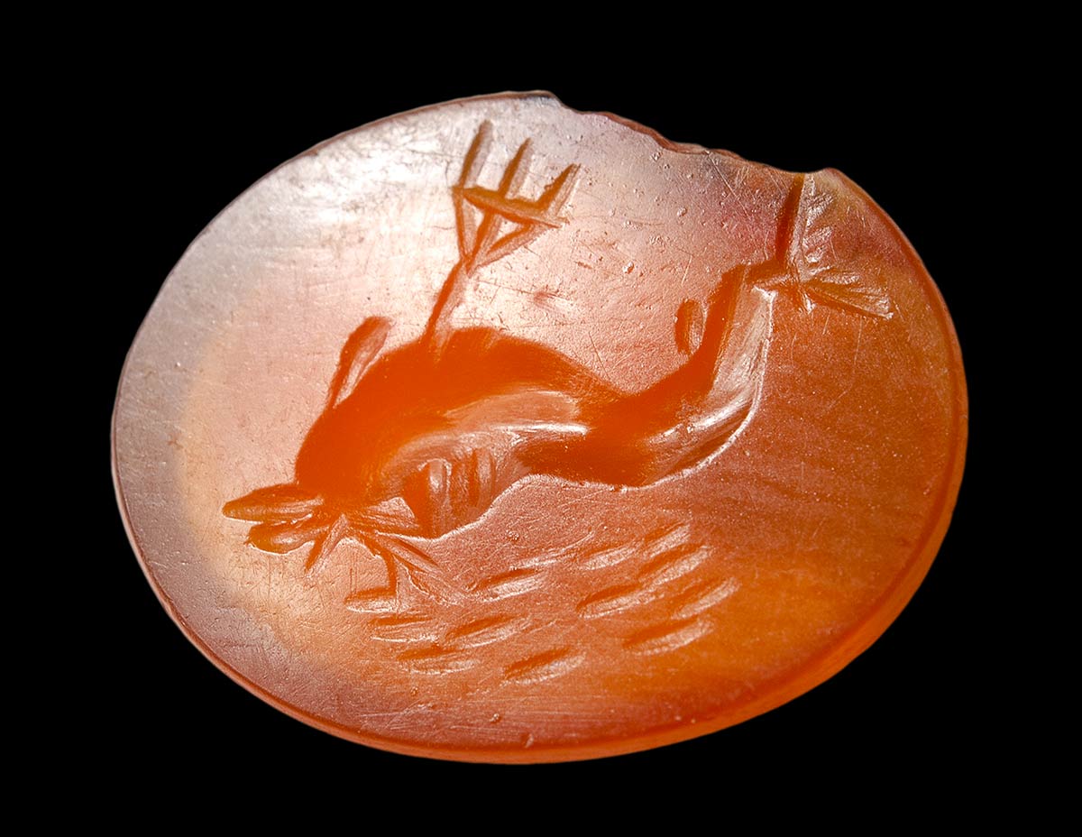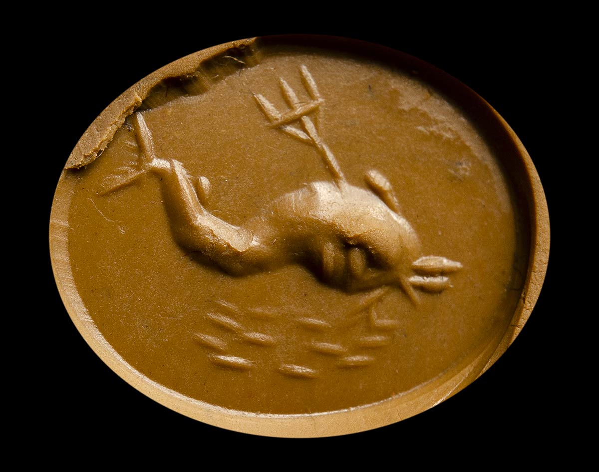 The sea animal facing left and flanked behind by a trident, symbol of the god Neptune. Below, the waves of the sea. Allegory referable to the cult of Neptune. Chip on the edge.