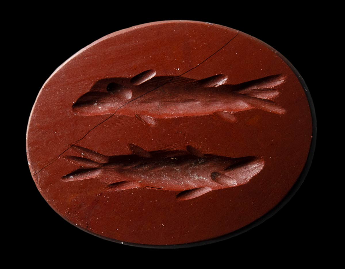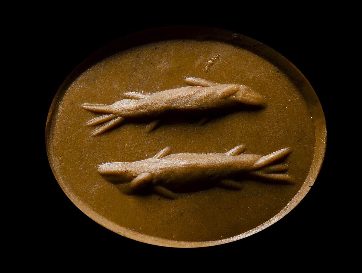 The scene shows two pisces swimming in opposite site. Characteristic of the astrological sign of the Pisces.