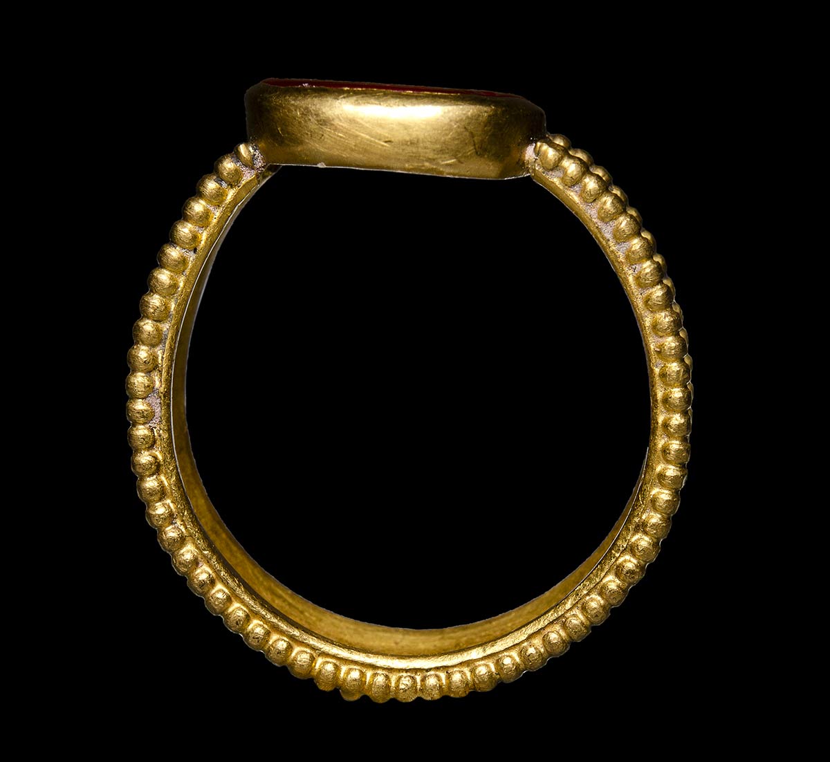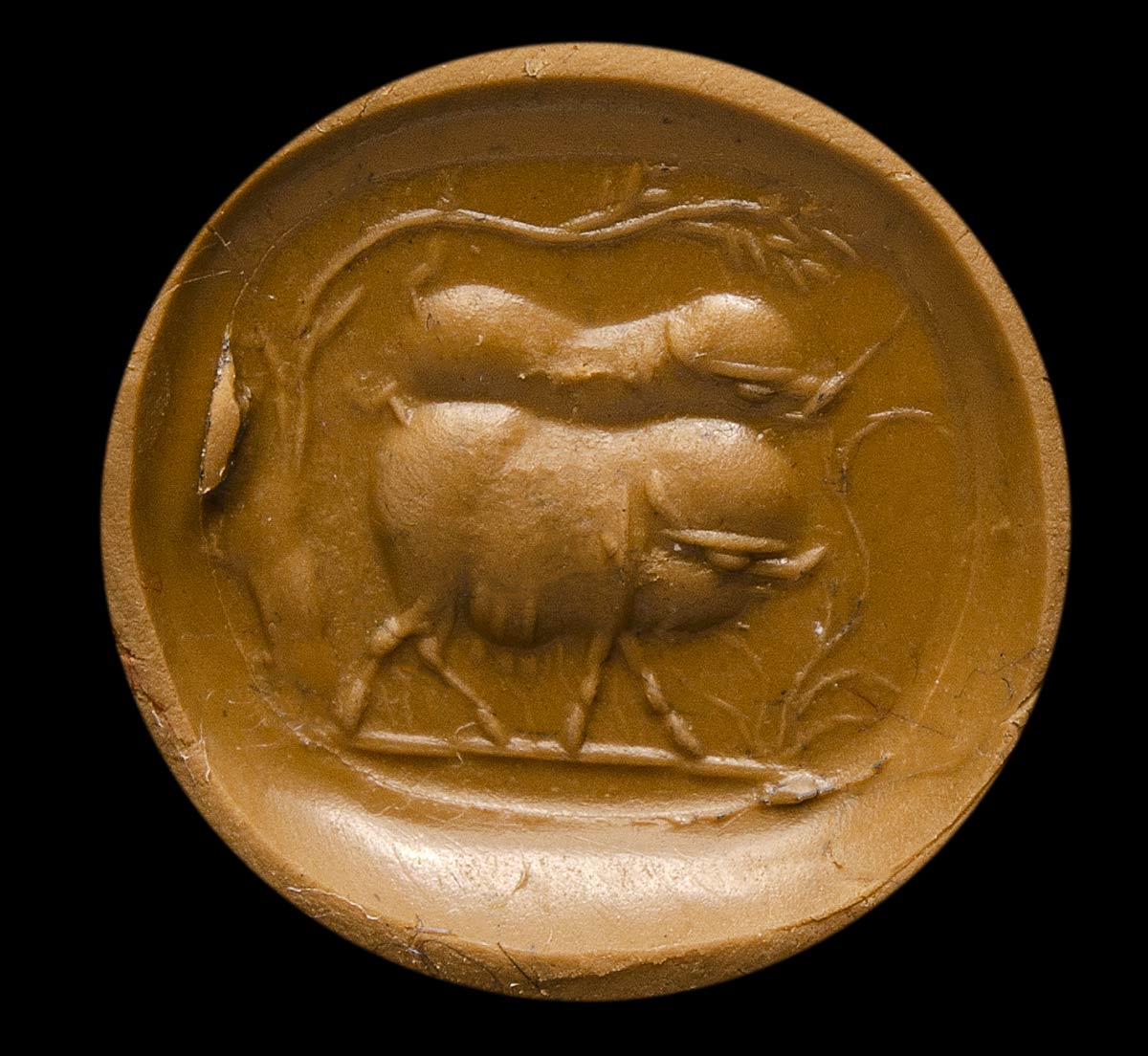 The scene consists of two sows (or one sow and one pig) facing left, under a tree; in front of them a plant. Ground line. The gem is mounted in a gold ring featuring a flat rod decorated on the edges by slightly flattened spherical elements: Very fine condition.