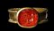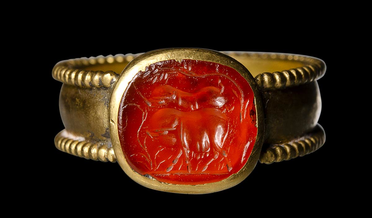 A roman carnelian intaglio set in a Postclassical gold ring. Two pigs.