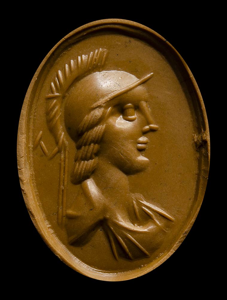 The goddess is facing left and characterized by a crested helmet, letting her hair uncovered around her face, and a draped bust. Slight wear marks and vivid color of the stone.