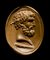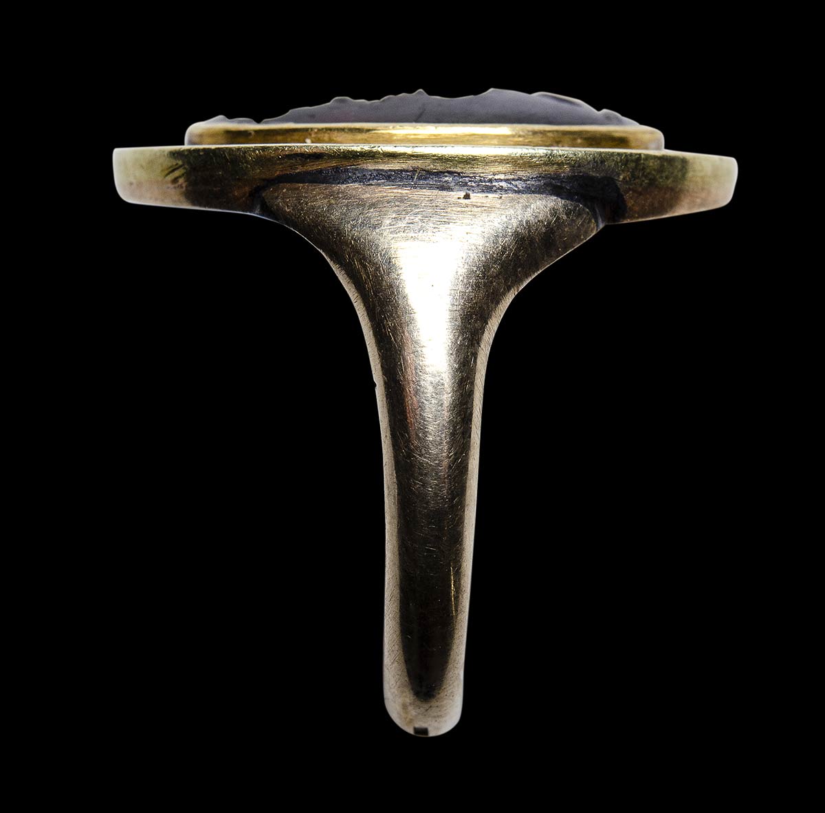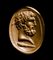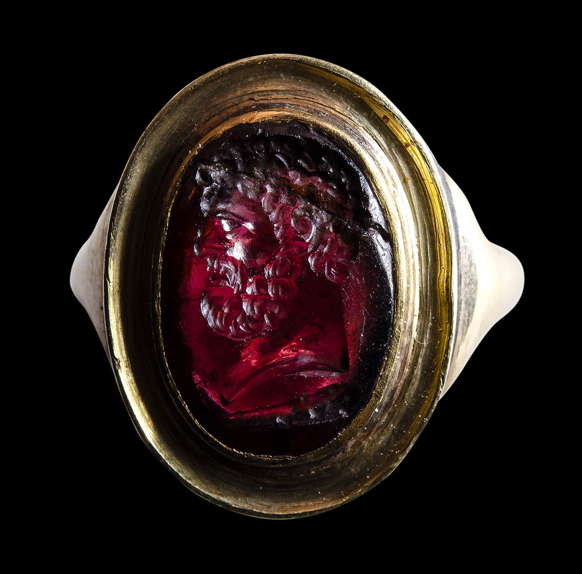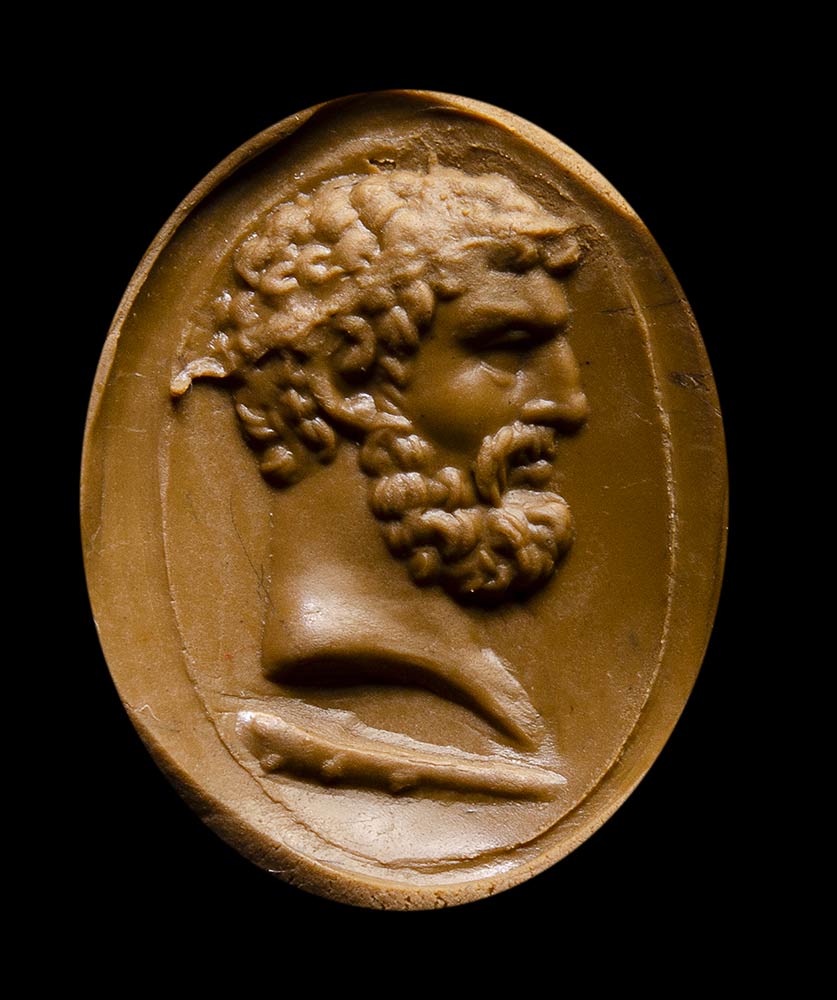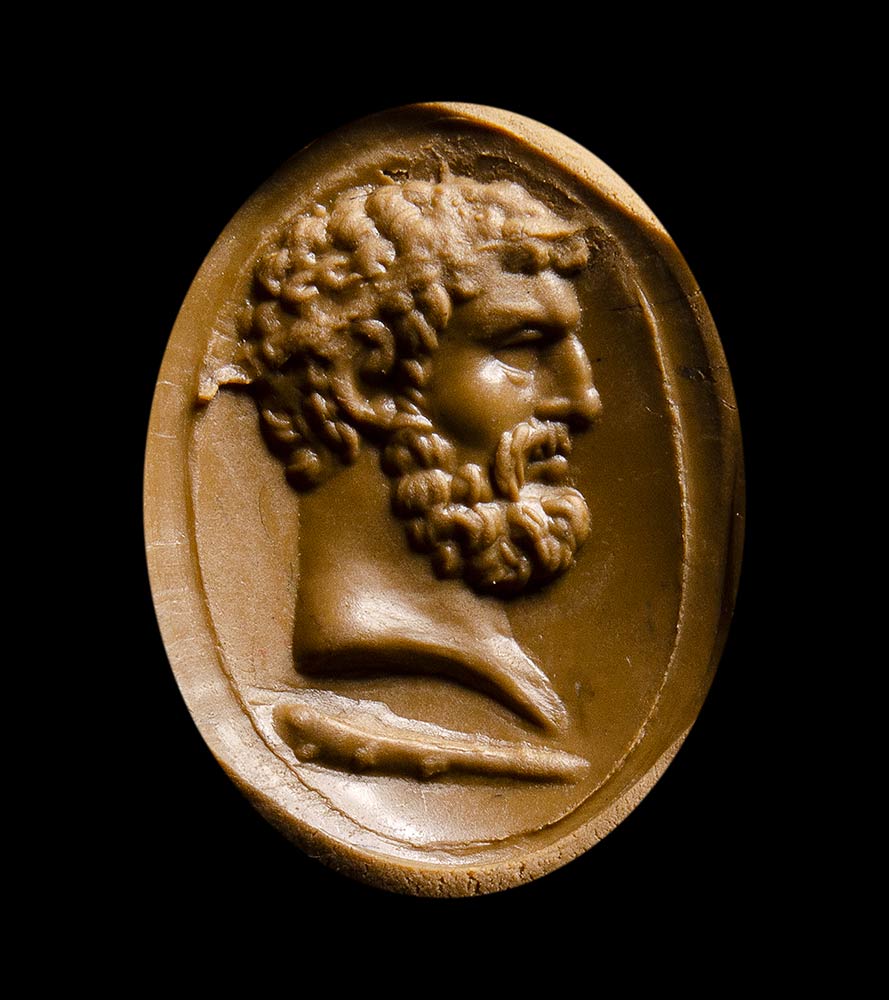 Rounded hoop flatten within with boarder shoulders and surmounted by a deep grooved bezel. In the center, the intaglio shows a bearded man portrait facing left. The face features are characteristic of the mythological hero Hercules, with strong jaws and neck evocating his strenght; strong nose, small lips and the forehead wrinkled showing his determination. The hair and the beard are engraved by deep engravings. The volume of the face and the neck are well rendered. Below, his club. The stone is cracked into the ring, in the upper part. Original Grand Tour Era gold mounting, with nice patina. Attractive color of the stone and very fine execution.