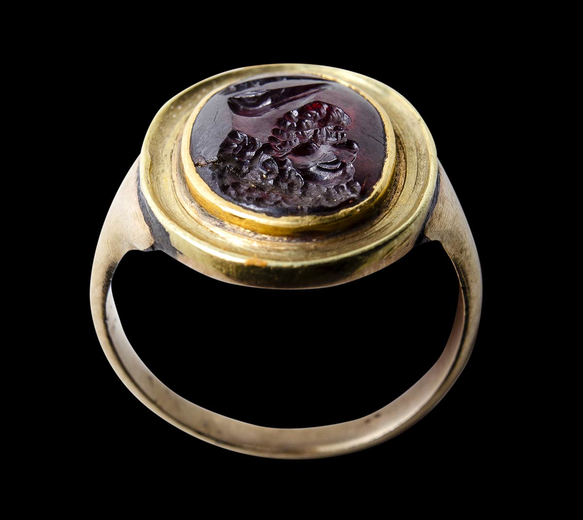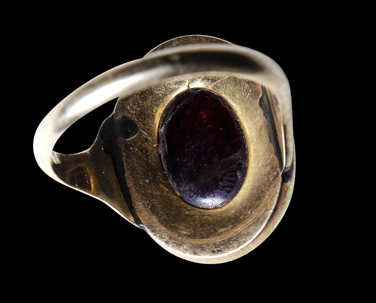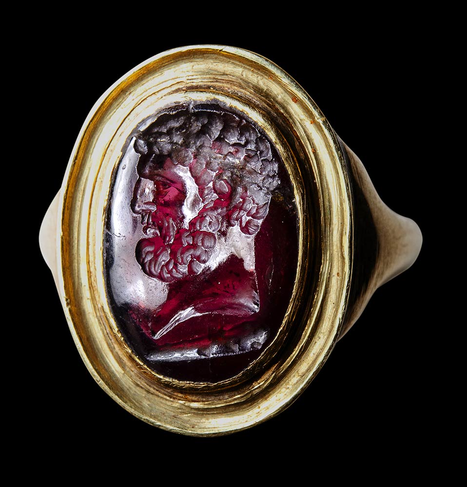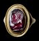 A roman garnet intaglio mounted on a Grand Tour gold ring. Bust of Hercules.