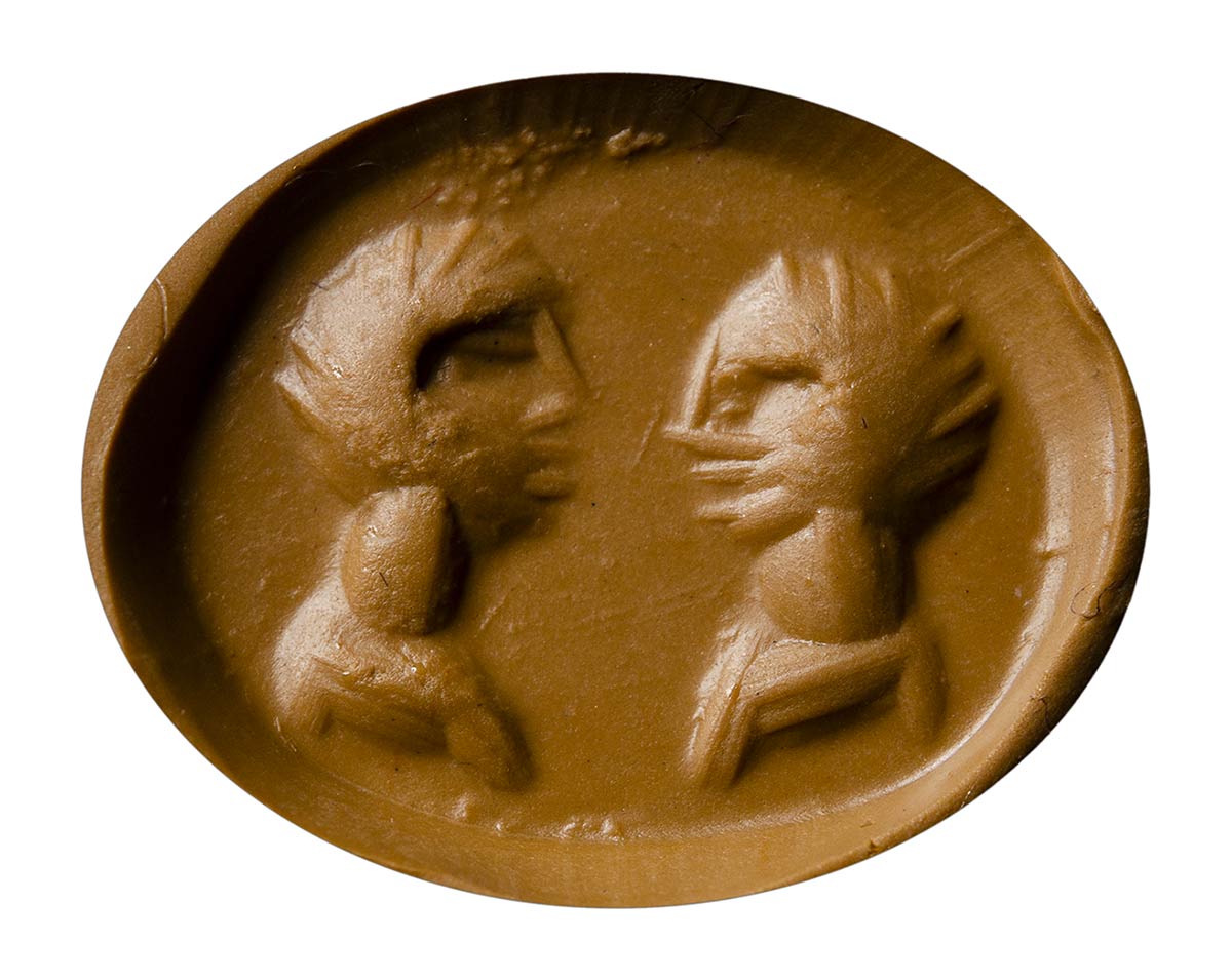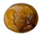 Two male portraits facing each other. Slight wear marks on the surface. Nice honey color of the stone with dark inclusions.