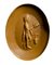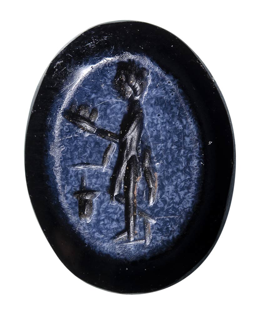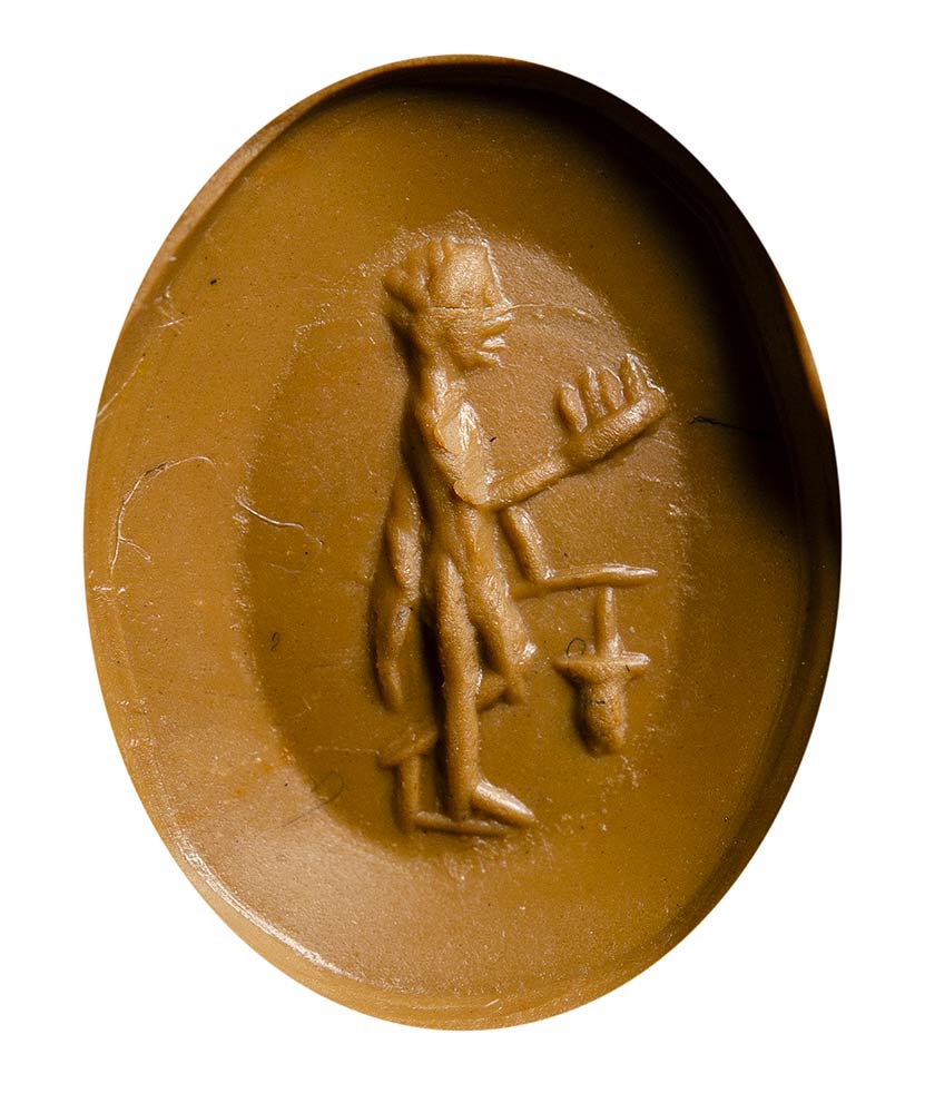 The male character is standing facing left, his right knee bent, with crossed legs. He holds a patera (?) in his right hand meanwhile the left holds a stick. In front, a bunch of grapes. Groundline.