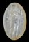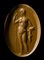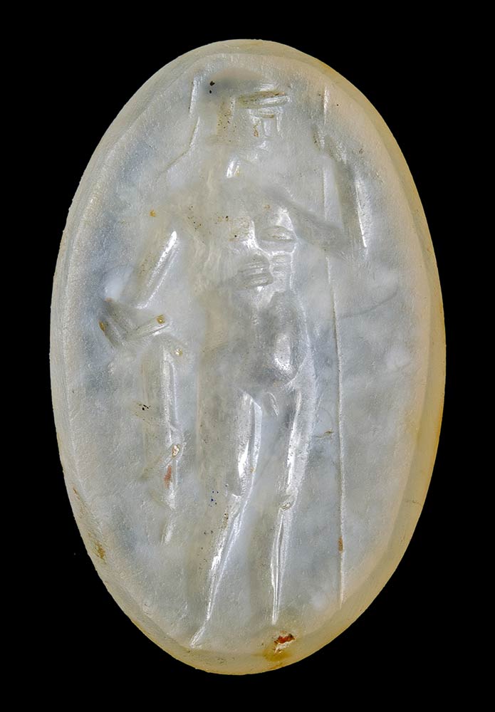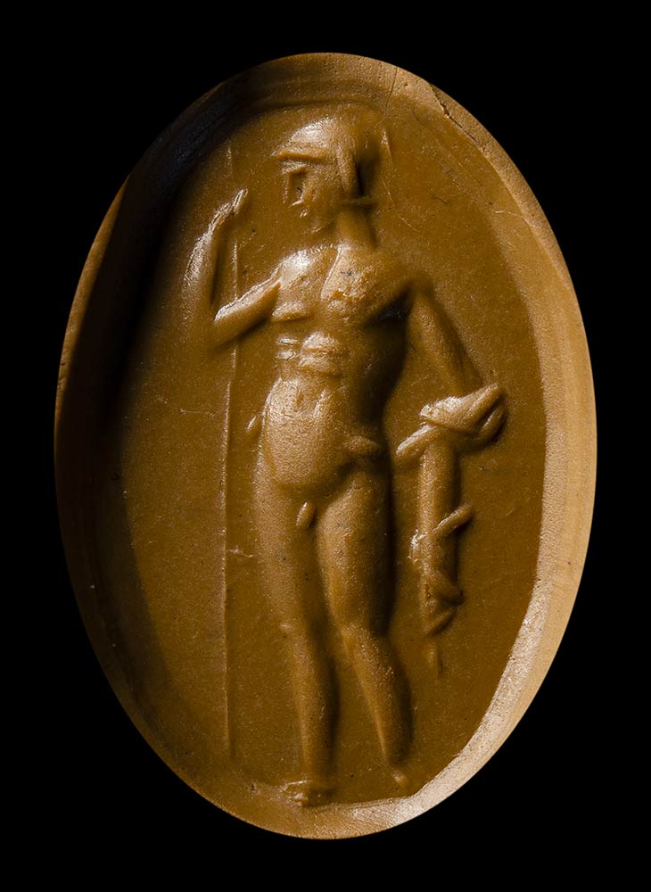The naked male figure is standing facing right. He wears a corinthian crested helmet and a cloak on his shoulders. His left arm bent, his hand holding a spear.