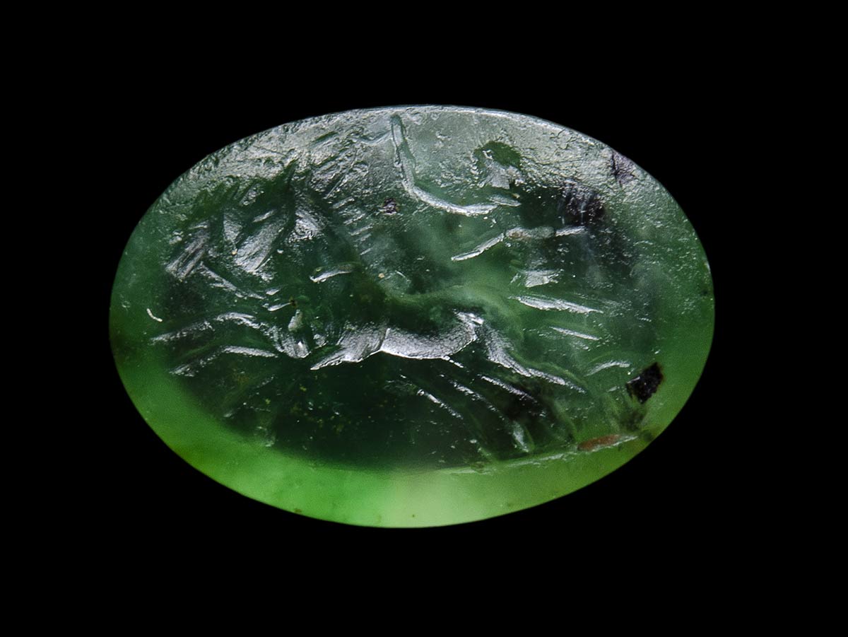 A roman green chalcedony intaglio. Biga.
