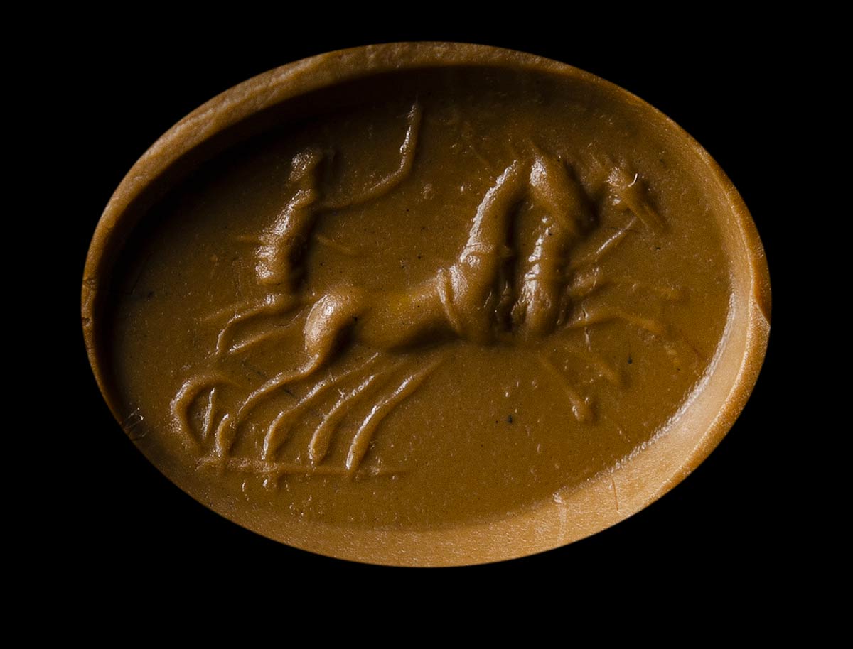 The male figure is ridding a biga facing left and whipping the horses. Groundline. Wear marks on the surface of the stone. Nice vivid color with dark inclusions.