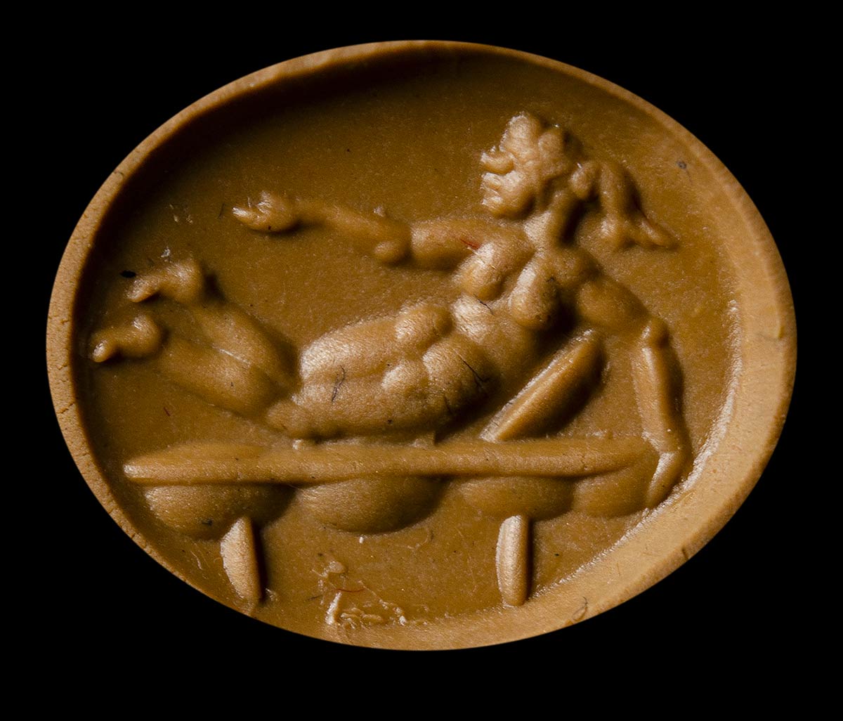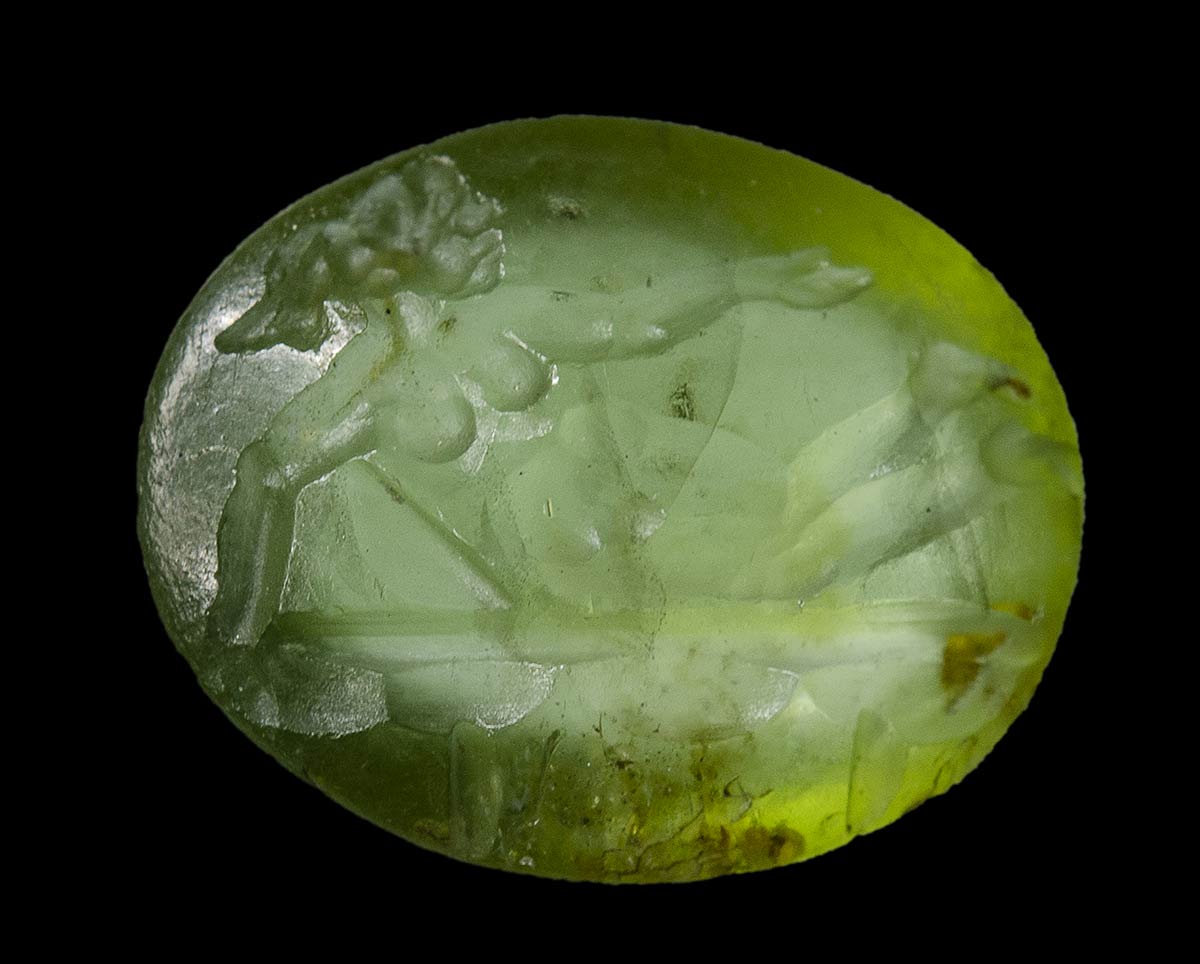 The naked woman is reclined on a kline, her head facing right. Left arm and lower part of he relis raised up. Use of drill in the execution. Wear marks.